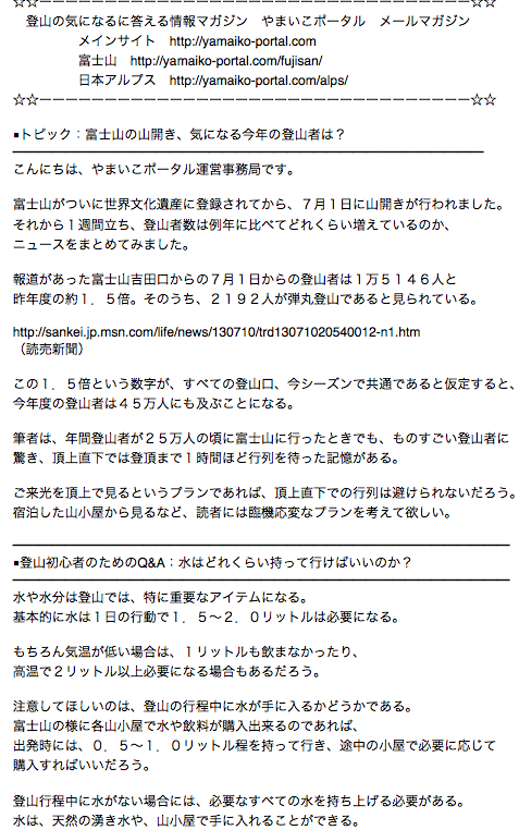 話題のトピックをメルマガでお知らせ 登山に関する素朴な疑問から、最新の登山情報まで 話題のトピックに関する情報を毎週月曜日にお届けします。 サンプルイメージ 登録はこちらから メルマガ購読・解除 登山の気になるに答えるやまいこポータルメルマガ 購読 解除 読者購読規約 >> バックナンバーpowered by まぐまぐ! ※メルマガシステムは「まぐまぐ」を利用しております。 まぐまぐでは、個人情報保護の観点から、読者のメールアドレスは保護されておりますので、 安心してご登録下さい。